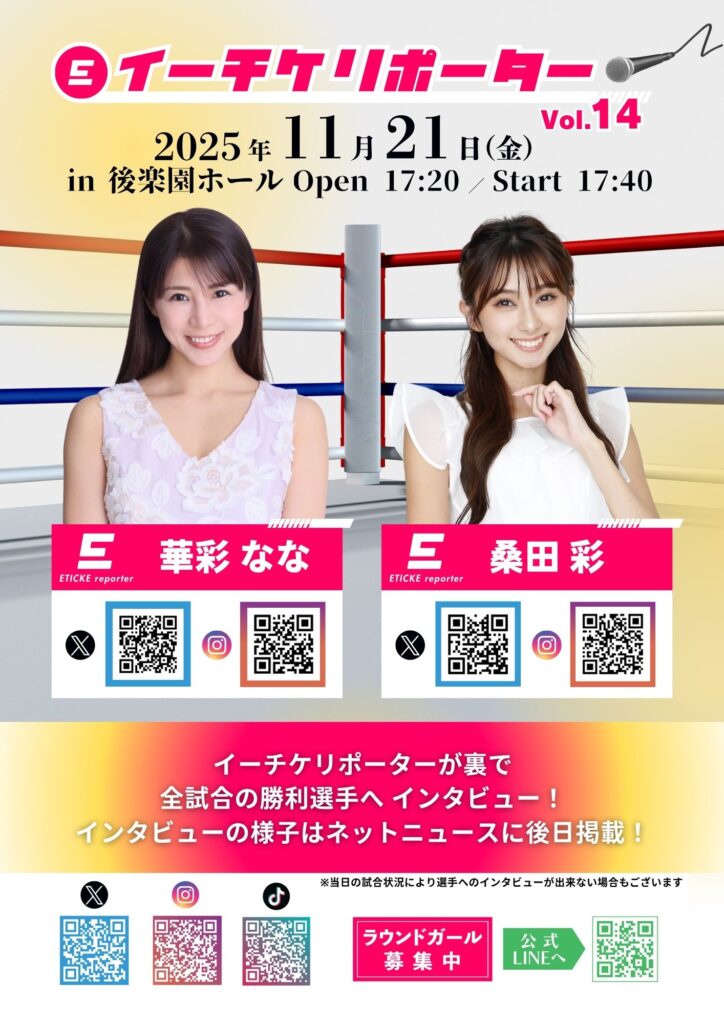 イーチケラウンドガールにイーチケリポーター誕生!~イーチケリポーターとして華彩なな・桑田彩が会場と勝... ~イーチケリポーター華彩なな・桑田彩がGOLDEN CHILD BOXING VOL.143にてリポーター兼イーチケラウンドガールとしても会場を盛り上げました~