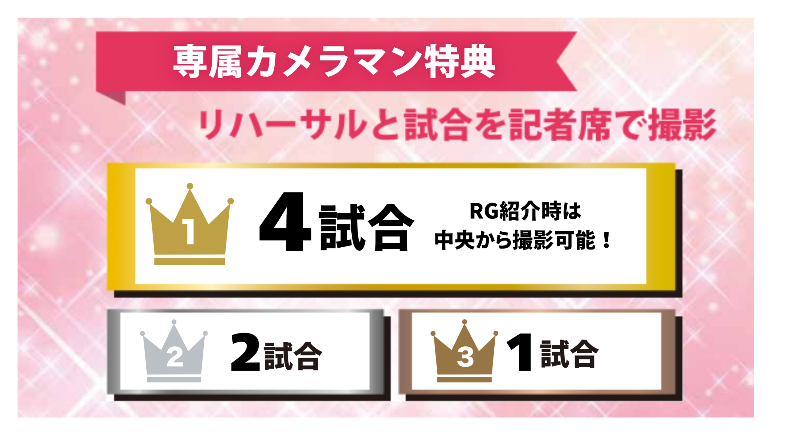 カメラP特典は、カメラポイント上位者だけが体験できるスペシャル企画です。リハーサル・試合中・オフショットを公式カメラマンとして撮影でき、VIP席招待やリングサイド撮影など、特別な視点からイベントを楽しめます。