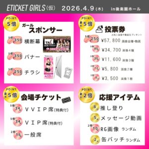 ETICKET GIRLS(仮) #6メンバーのランキングをチェックできます。投票期間中にアイテムを購入して応援しよう!