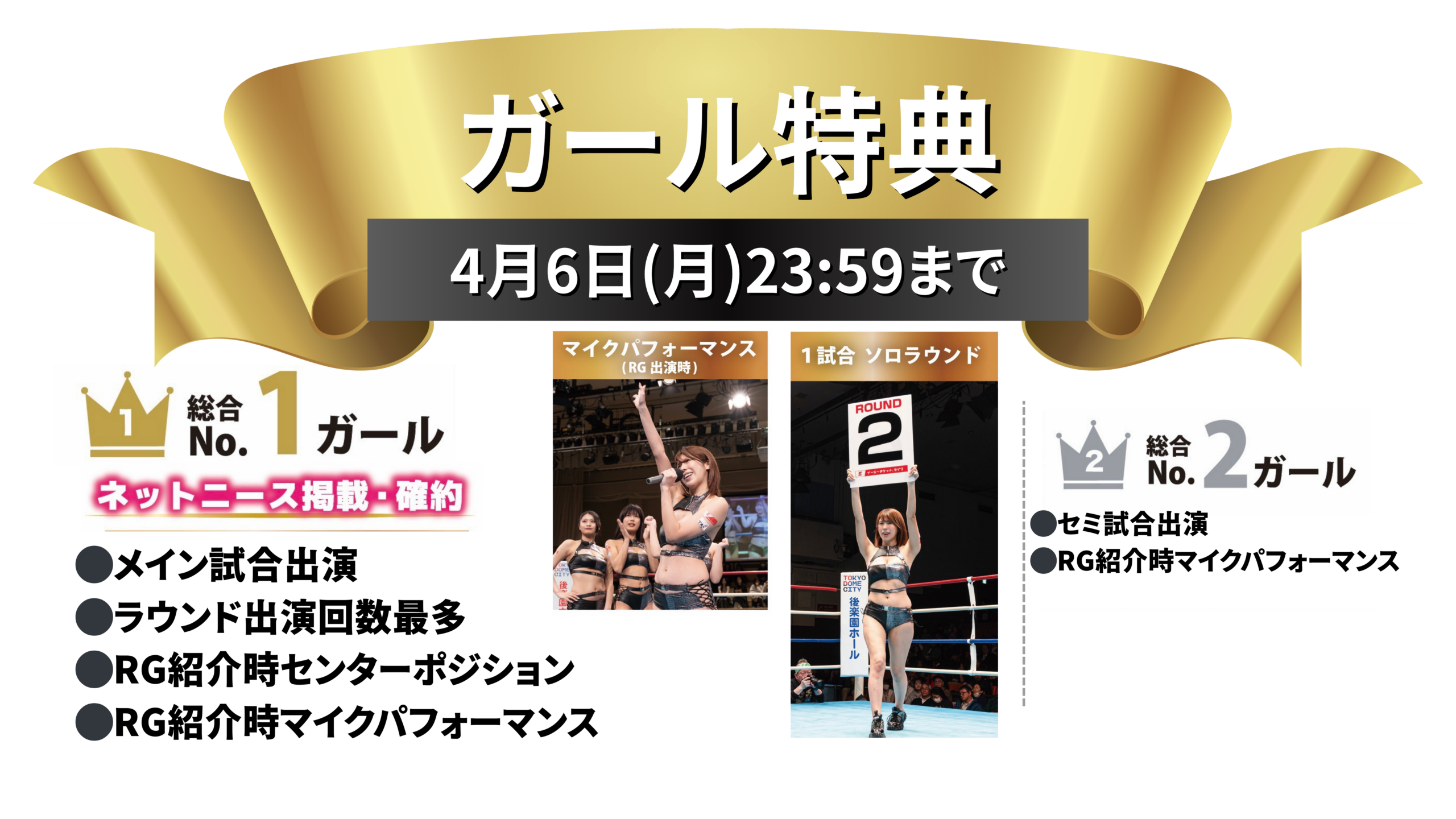 ガール特典は、ランキング上位のガールに与えられる特別演出です。1位はソロラウンド演出・マイクパフォーマンス・メイン試合出演など豪華に、2位もセミ試合出演や演出回数が増えるなど特典が用意されています。